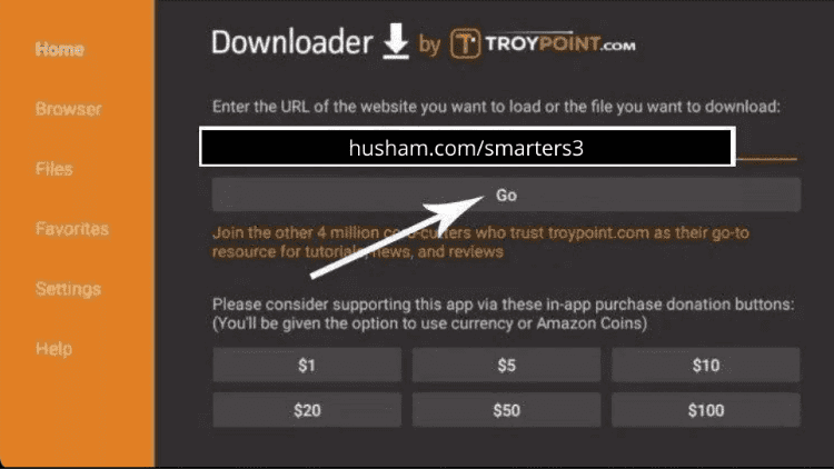 Step 16: Type the following URL exactly as shown here: https://www.iptvsmarters.com/smarters.apk and click Go.